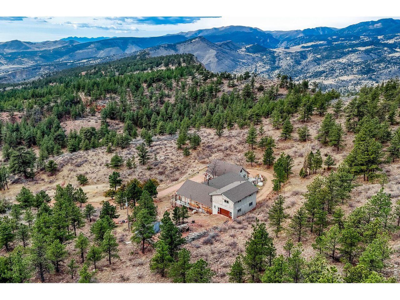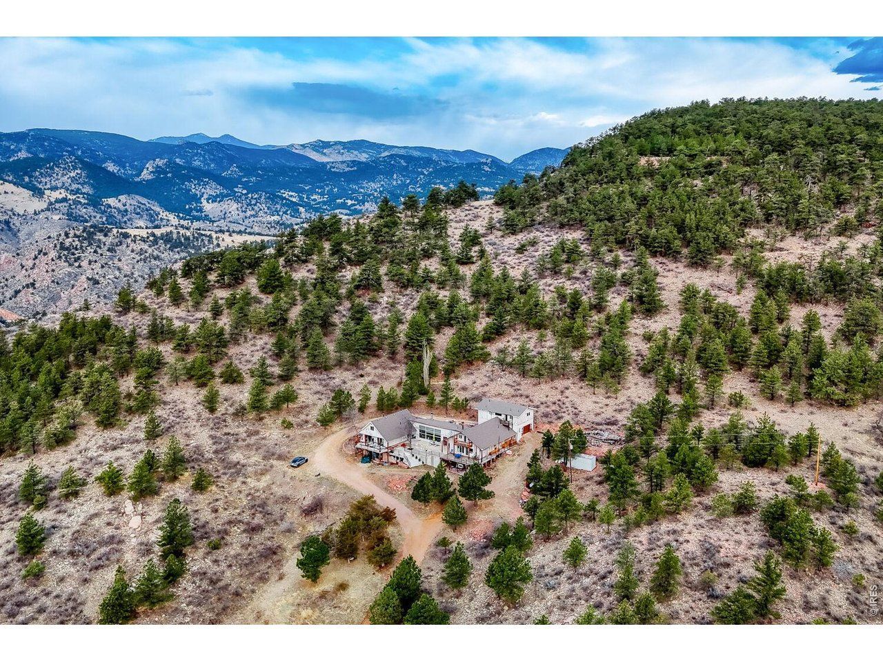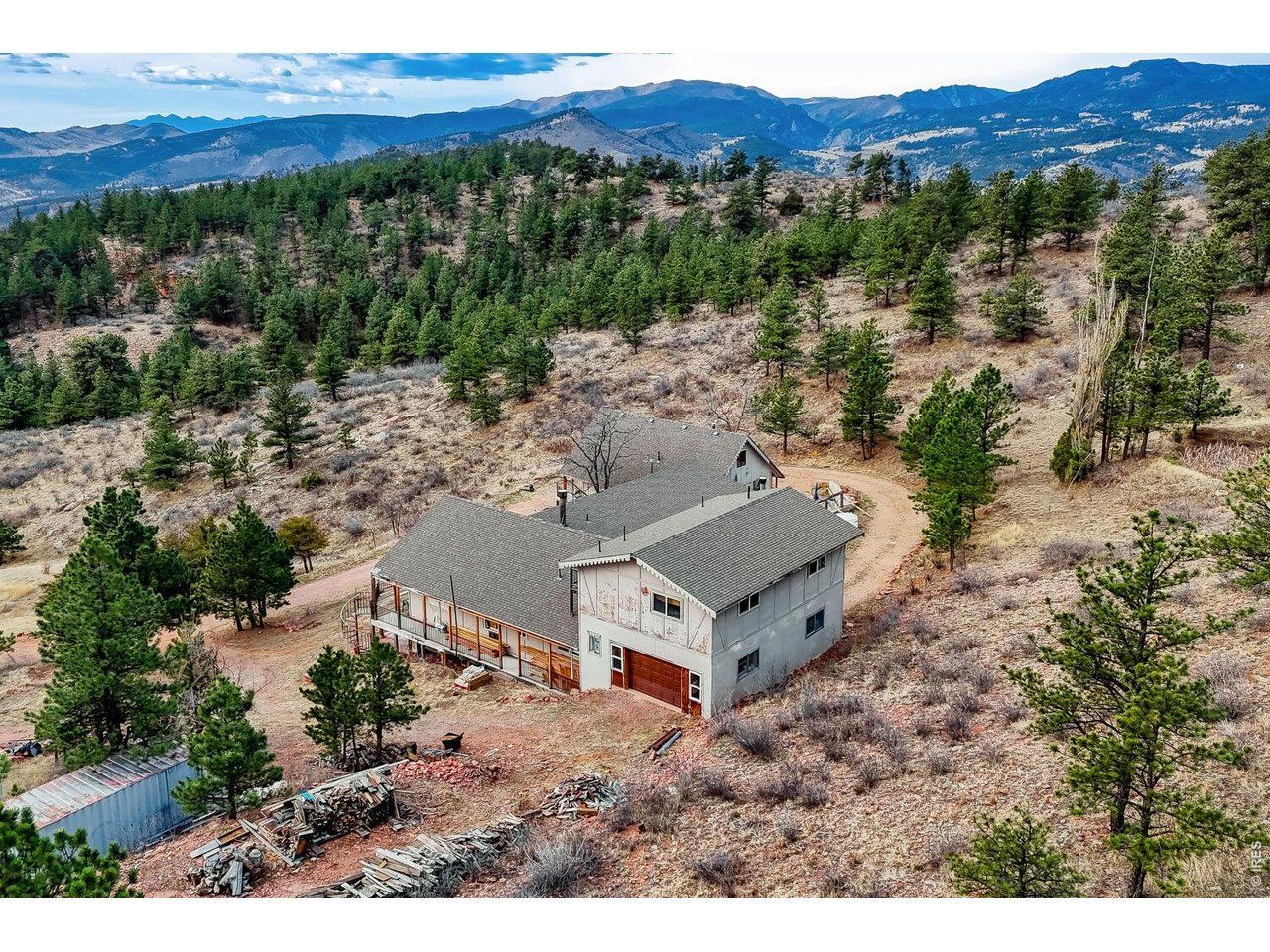 PRIVACY. Panoramic VIEWS of Pikes Peak. Apple trees on your driveway up! This unique flagstone/concrete solarium home is perched atop of its own hill with 21.4 acres to offer in Boulder County. Surrounded by 1200 acres of Wildlife reserve land for the monitoring of bald/golden eagles, and 80 acres of private land. Dramatic West/East Wing layout the home centers a sun warmed solarium living room with 15-foot floor to ceiling windows. Hardwood flooring throughout. French inspired finishes. Marble and tile countertops. Stainless Steel Appliances. Multiple Private living areas. Flagstone floor Wine Cellar doubles as a mother-in-law retreat. Art Studio/Den. Upgraded Fireplace. Expansive reinforced NEW concrete deck that sprawls the entire front of the home. Grapevine-covered patio just off the primary suite. The primary bathroom features dual bathrooms and separate his-and-hers closets. Private water well and cistern system. LARGE Insulated Drive Through Garage and storage. Rock warming South facing driveway. Spacious Outdoor flat area to build your next shop, garage, or barn. Built in concrete safe room. Thoughtfully priced to allow for your final custom outdoor enhancements, the property presents a compelling upside. NO Drive BYS, by Appointment only.
