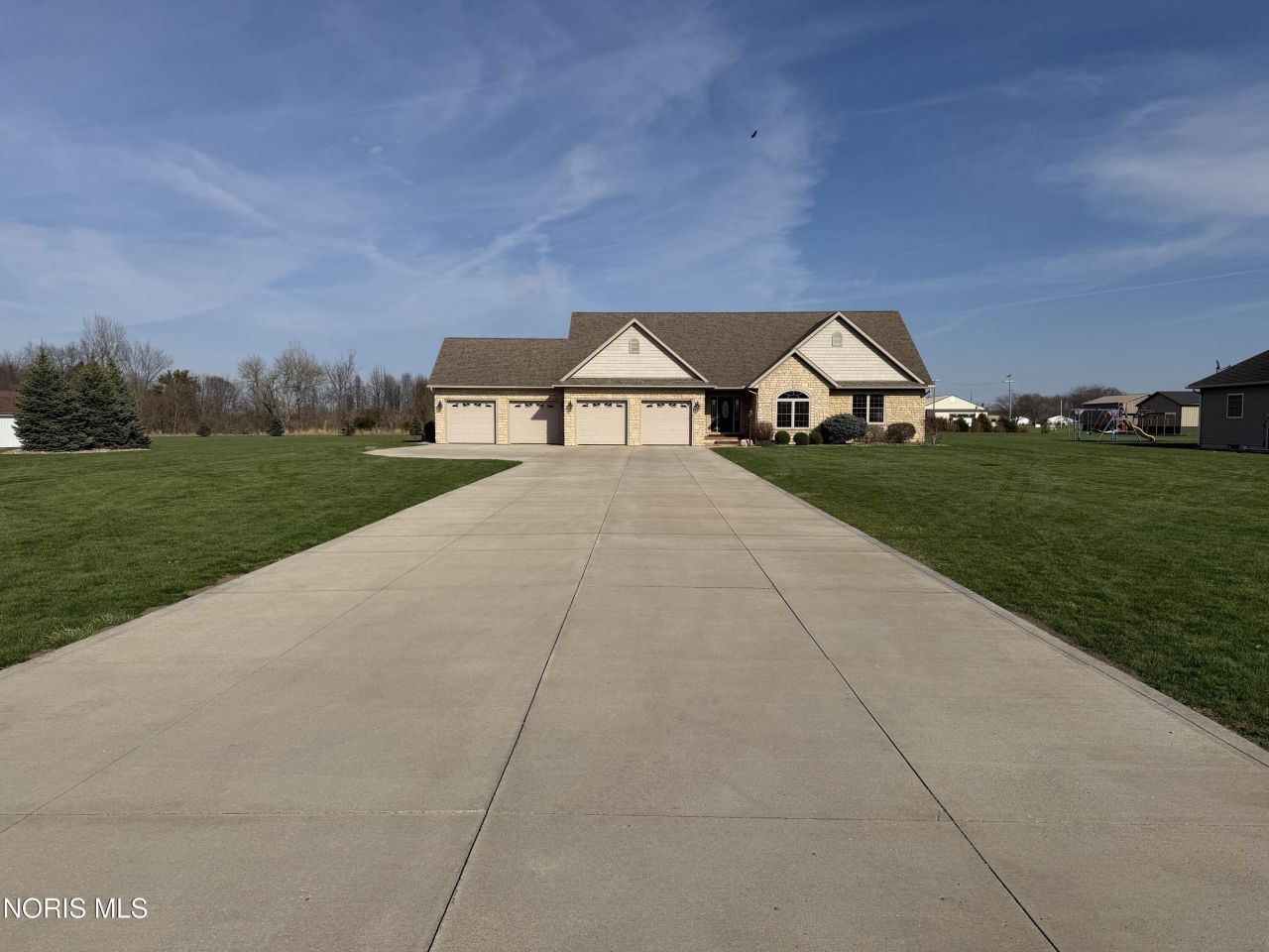 This custom-built ranch home, featuring stone and vinyl siding, sits on 1.3 acres and offers six bedrooms, 4.5 bathrooms, and a four-car heated attached garage with a concrete driveway. Built in 2013, the home combines quality craftsmanship with comfort and convenience. The main level provides 2,420 square feet of thoughtfully designed living space, complemented by a fully finished basement with a kitchen that adds flexibility for recreation, guests, or a home office. The open-concept layout is filled with natural light and includes a private primary suite with a heated bathroom floor for added comfort. The custom kitchen features generous cabinetry and ample workspace, making it ideal for both everyday living and entertaining. With city utilities, abundant storage, and a functional layout, this home delivers the best of modern ranch-style living with the ease of single-level convenience. Enjoy sitting on your back deck with a gas hook-up for your grill and watching your Husqvarna 450X auto mower mow your yard!!!
