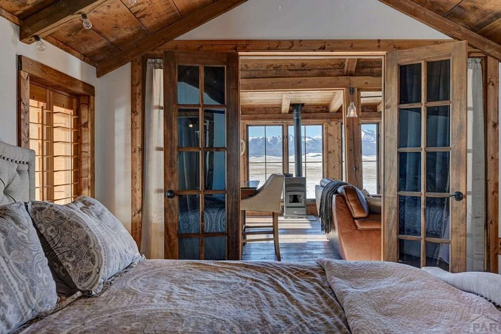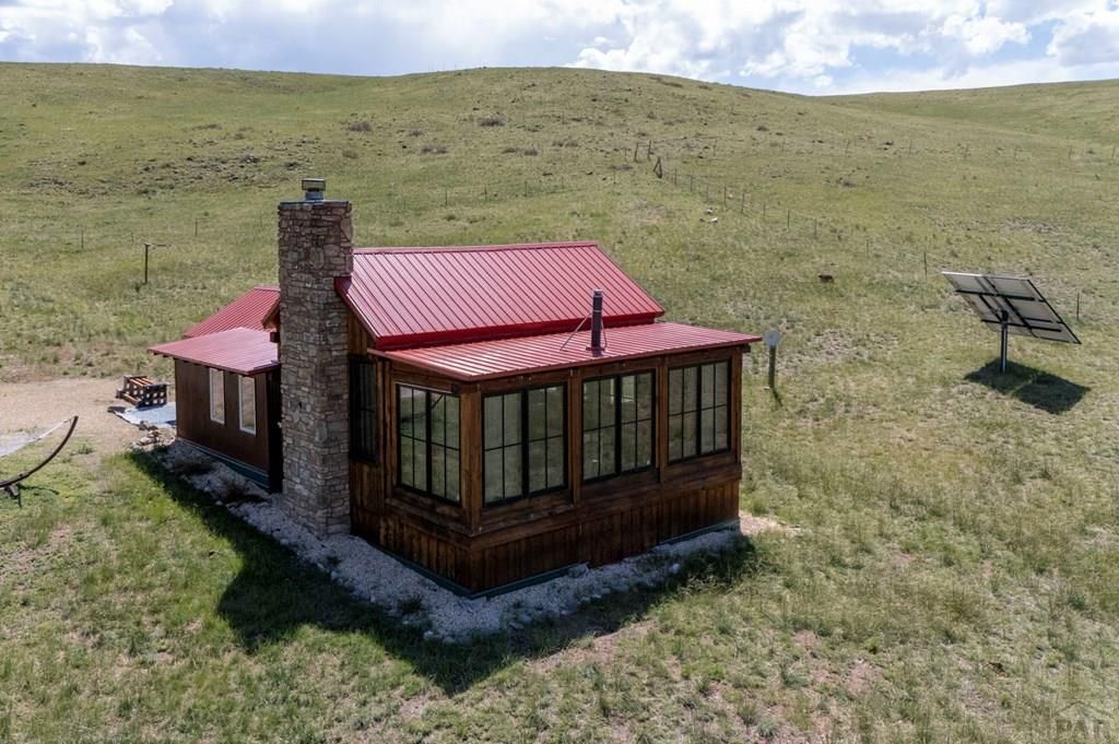 Welcome home to your own cozy off-grid mountain sanctuary, featuring postcard worthy panoramic mountain views and set on a sprawling 38.13 acre property. Nestled before the stunning Sangre de Cristo range, this home blends rustic mountain charm with modern day upgrades. Designed by the talented architect Karen Sund, the home's interior matches rustic wood and stone to further compliment the scenic surroundings. Inside, you're greeted by an open floor plan highlighted by an impressive stone fireplace in the main living area. An updated kitchen, complete with granite countertops and an island, offers an abundance of countertop space. The updated full bath is hallmarked by a soaking tub, walk in shower, and updated countertops. This home may be purchased all furnishings currently remaining in the property.The bunk house offers sleeping space for up to four guests and includes its own bathroom and shower. Outside, you'll notice the wood exterior of the property has been freshly stained. The lot itself is fully fenced, with usable acreage ready for livestock of your choosing. This property is truly off grid - the solar system is owned, with new batteries installed in 2020. Heat is offered by the wood burning fireplace in the main living space and supplemented by a gas stove in the sunroom. A portable backup generator offers extra energy security; the domestic well is rated for 6GPM and may irrigate up to 1 acre.