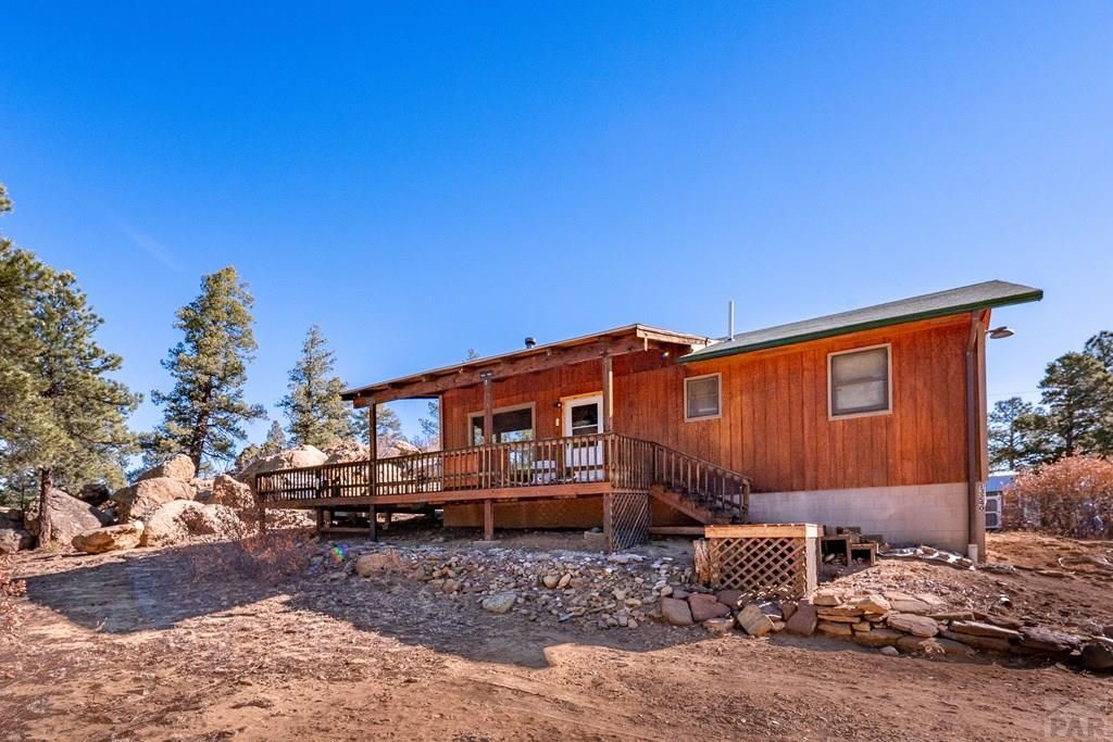 Escape to your own private Colorado mountain retreat on 35 acres in the desirable Big Pine Ridge subdivision! This 2 bed, 2 bath home offers the perfect blend of seclusion, privacy, and outdoor recreation, surrounded by towering pines, dramatic rock outcroppings, and breathtaking natural beauty. Inside, you'll find a warm and inviting open-concept floor plan featuring vaulted ceilings, exposed wood beams, and a cozy wood-burning stove, creating the ideal cabin-style living experience. The kitchen flows seamlessly into the living and dining areas, perfect for entertaining or a peaceful getaway. Step outside to the spacious wraparound deck and enjoy abundant wildlife, mountain air, and true peace and quiet. The property features multiple established trails for ATV riding, hiking, and horseback riding, making it a dream for outdoor enthusiasts. Located just minutes from the Highway of Legends Scenic Byway, with easy access to fishing, hiking, and skiing, this area is truly a paradise for adventure seekers. Situated in Colorado GMU #85, the property is frequented by elk, deer, bear, turkey, and other wildlife. Enjoy your own private space to hunt and sight in rifles right on your land. Surrounded by expansive public lands, including San Isabel National Forest and the Spanish Peaks, offering endless outdoor recreation. Whether you're looking for a full-time residence or vacation home this rare acreage property checks every box for Colorado mountain living.