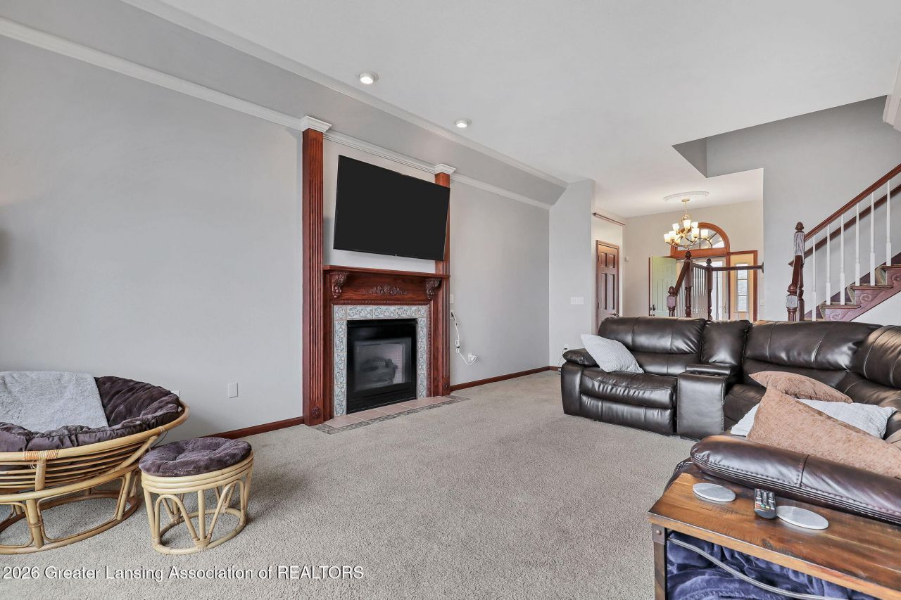 Welcome to 146 Canterbury Dr, Charlotte Mi. This home has so much to offer! Entering thru the enclosed front porch with tile flooring, leading to the open, bright foyer and living room with a full wall of windows and a gas fireplace. There is a formal dining room or den that is off the foyer and kitchen. Beautiful open and spacious kitchen with appliances, eat in dining room and breakfast bar.. Tons of cabinets, bread box and countertop space. A cooks delight. Kitchen has slider doors to the nice deck overlooking the back yard.. There is a storage shed under the deck. Main floor also features a half bath, mud room (laundry hook ups available) from the 2-car garage... You will love the large main floor private primary suite featuring a whirlpool tub, stand up shower.... new double vanity, walk in closet and large windows looking over the back yard;.. Second floor features 2 additional bedrooms, large linen closet, built ins and a full bath. Nice partially finished lower level with an additional 4th bedroom/hang out room/office and full bath. Plenty of storage area and room to finish the rest of the basement for your needs. Nicely landscaped lot in a great location. This is a must see!!!