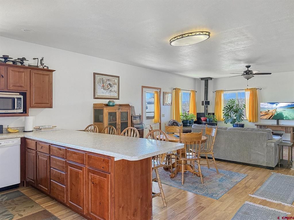 Discover the perfect blend of comfort and convenience in this delightful two-bedroom, one full bath home located in the heart of Crawford on a .40+-acre lot. Featuring soaring ceilings and a generous mudroom, this residence is designed for easy living. Nice workspace in this oversized large two-car garage with big TALL garage doors with opener for you bigger vehicles or projects. Garage is equipped with 220 power, ideal for any DIY enthusiast. With its durable metal siding and roof, maintenance is a breeze..or almost nonexistent. Stay cozy with the NEW WOOD STOVE and in-floor radiant heating fired by natural gas throughout, including the garage. High Speed Fiber Optic is another plus in this quiet mountain town. Just steps away from the park, playground, and directly across from Crawford Town Hall, this home is also within walking distance of Crawford Montessori School. Embrace a vibrant small town country community lifestyle in this fantastic location. Lovely views and a wrap around privacy fencing on the front, back and side of the big yard! Room for off street parking of any kind, pets, or you name it, just pull your camper in the HUGE back yard. CLEAN CLEAN CLEAN solid home. Nice spacious bathroom with tub/shower with good hand grab bars installed.