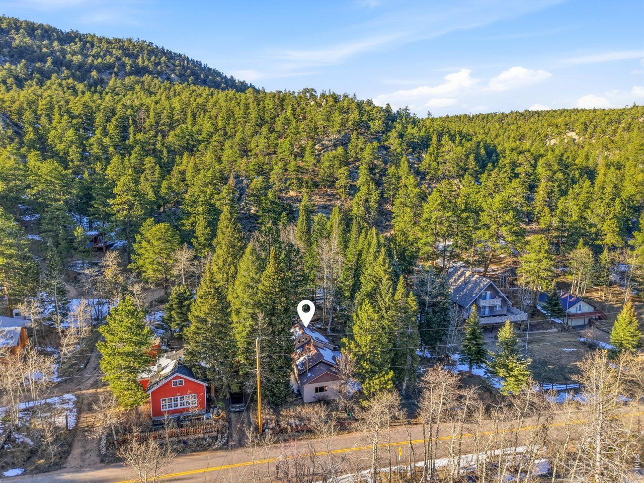 Cozy and charming cabin on 2+ lots with an awe-inspiring stand of gigantic, beautiful, stately spruce trees! Cabin features an updated bathroom, and an 11 x 6 loft area off of primary bedroom for children to sleep and/or play in! Lot features a detached 220 sq.ft. workshop/studio building; plenty of off-street parking, newer septic system (2006); seasonal water supply via shared ditch. Enjoy the view and sound of the middle St. Vrain Creek right across the roadway!