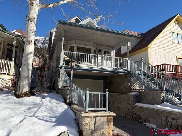 Discover a rare opportunity to create a custom mountain retreat in the very heart of Ouray, Colorado, often called the ???Little San Francisco of the San Juans.??? Located on the uphill side of 4th Street, just one block from the Ski Hill, this quiet and scenic property sits among some of Ouray???s most sought-after historic Victorian homes, offering a setting that perfectly blends mountain charm, walkability, and breathtaking alpine scenery. Rooted in Ouray???s mining-era history, this unique home was thoughtfully created by blending a historic cabin with an ideal in-town building site. The result is a flexible mountain residence with duplex potential, featuring intelligently aligned entrances and stairways that allow for private, separate living spaces. Since its creation, the property has been a highly successful year-round rental, and the zoning allows long-term rentals of 30 days or more, addressing one of Ouray???s most in-demand housing needs. Accessed via a south-side stairway, the home immediately showcases smart engineering for alpine conditions. Welded metal stairs and railings allow snow and ice to pass through, reducing winter maintenance and enhancing safety. At the top, a welcoming west-facing porch overlooks town with commanding views toward Twin Peaks and the Rock of Ages, setting the tone for the mountain lifestyle this home delivers. From the porch, you may enter the main living level or continue to a secondary entrance???ideal for a private duplex unit or flexible multi-use living. The lower level features a spacious great room with soaring ceilings, abundant southern windows, a bay window framing eastern mountain views, and a large private bath. The rear portion connects seamlessly to the main-level kitchen, dining, and office spaces, along with a second full bath. A back door opens to a covered rear deck, while interior stairs lead down to the full garage and workshop/studio area below. The upper level is truly show-stopping, offering open, light-filled living with a well-sized kitchen and dining area, bedroom space, and a flexible living room. Step outside to the signature southwest-facing patio, where sweeping mountain views define the experience. The east end of this level delivers unobstructed vistas of Ouray???s famous Amphitheater, the dramatic mountain bowl above town known for its unforgettable nightly alpenglow. The full-length lot includes a walkway to a storage area and a covered parking pad accessed from the alley???an ideal location for a future garage or potential