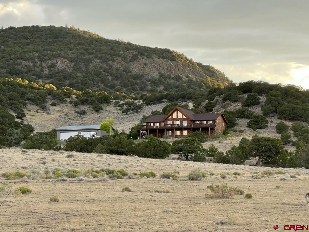 This large 3-level log home on a hill west of Saguache is a rare find. The home features radiant floor heating throughout, an attached 2-car heated garage, home theater, a bonus room, hot tub/exercise room and large storage room on the lower level. The main level has a huge deck, a spacious primary bedroom with a walk-in closet and its own ensuite bathroom which features a 2-sink vanity, jetted tub and walk-in shower; 2 nice sized bedrooms, both with walk-in closets; and an additional full bathroom with quartz counters. The main level also boasts a kitchen with beautiful granite countertops, laundry, and a huge living room with incredible views of the Sange De Cristo Mountain Range and the Great National Sand Dunes. The upper level has a cozy loft area that overlooks the living room. There are views from every window in the home. Furthermore, there is a whole house water/iron filtration system along with a water conditioner that stays with the home. Additionally, the interior of the home was painted in the summer of 2025 along with new carpet installed on the main level and new LVP in the bathrooms. The 40 acres is surrounded by BLM and conservation easement lands, has 2 springs, a domestic well, and features many pinon trees that produced a lot of pinon nuts this past summer. Additionally, it hosts a variety of wildlife, including: elk, deer, bear, mountain lion and more. New concrete spanning the southside of the home as well as a sidewalk that spans the length of the shop, log shed and ATV storage area, was poured during the summer of 2025. There is a 30' x 50' insulated shop with 2 bays (one measuring 12???H x 20???W, the other at 12???H x12???W), a concrete floor, furnace and electric throughout. Also, there is a 12' x 16' log storage building with a concrete floor and electricity, and a 16' x 16' covered ATV storage area with open front and concrete floor. This amazing home and location is an outdoor enthusiast/hunter???s dream.